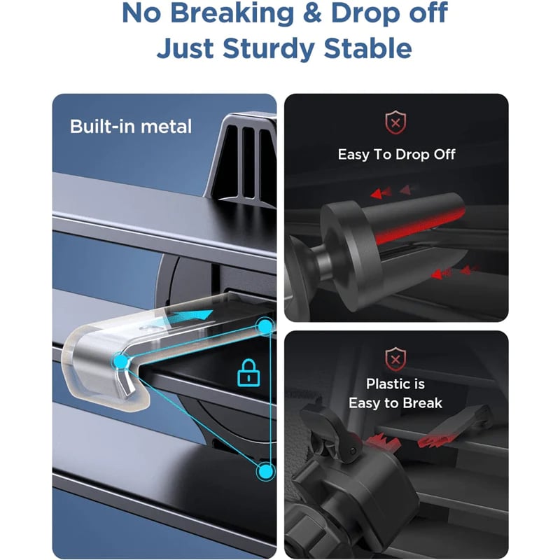 - [Latest Design-Never Fall Off]Adopts latest fall-proof locking design which holds your phone securely to the vent. This car phone holder has stable trapezoid-structure clamps with thickened shockproof sponge and rubber, which could hold the phone steadier than others.