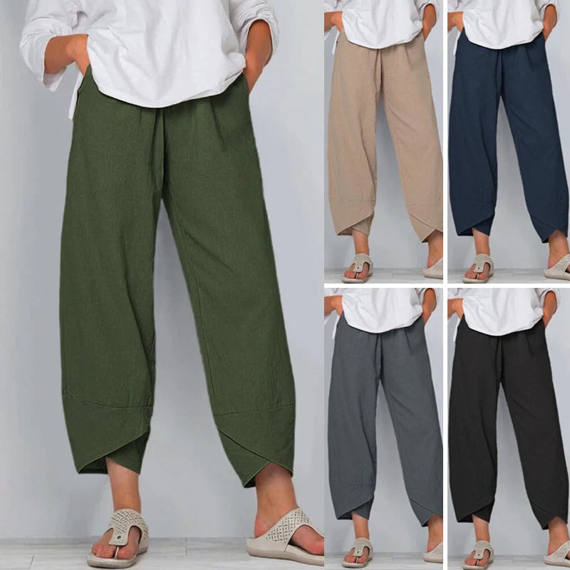 The pull-on closure and elastic waistband make it super easy to get on and off. Loose style, more relaxed waist make it the most suitable. The solid color makes it easy to match a t-shirt or a blouse. Straight wide cut cotton pants with pockets for women. Suitable for spring and summer.