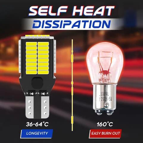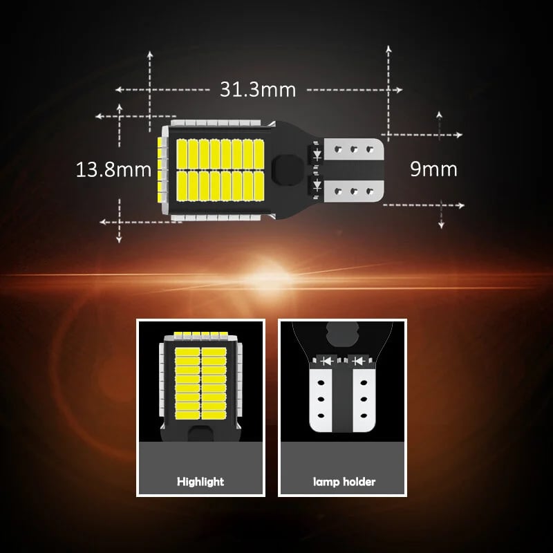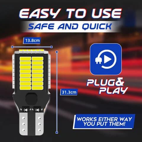 - No more worrying about backing up at night with our Super bright output LED Taillights. 54 pieces of high power and high illumination 4014 SMD LED chips per T15 LED backup reverse bulb. Working Power: 7.6W; Working Volts: 12V - 24V, energy-saving.